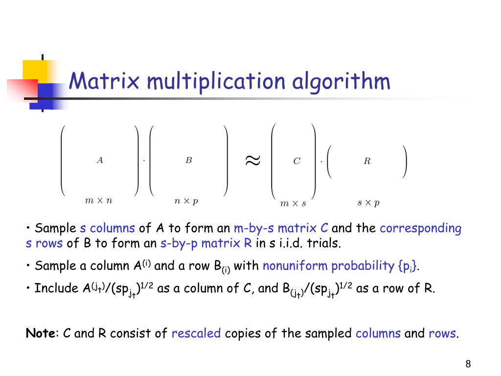Matrix multiplication algorithm • Sample scolumns of A to form an m-by-s matrix C and the corresponding srows of B to form an s-by-p matrix R in s i.i.d. trials. • Sample a column A(i) and a row B(i) with nonuniform probability {pi}. • Include A(jt)/(spjt)1/2 as a column of C, and B(jt)/(spjt)1/2 as a row of R. • Note: C and R consist of rescaled copies of the sampled columns and rows.