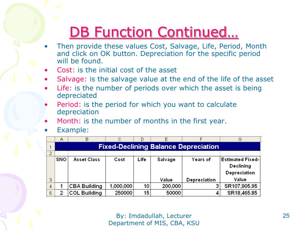 DB Function Continued… • Then provide these values Cost, Salvage, Life, Period, Month and click on OK button. Depreciation for the specific period will be found. • Cost: is the initial cost of the asset • Salvage: is the salvage value at the end of the life of the asset • Life: is the number of periods over which the asset is being depreciated • Period: is the period for which you want to calculate depreciation • Month: is the number of months in the first year. • Example: By: Imdadullah, Lecturer Department of MIS, CBA, KSU