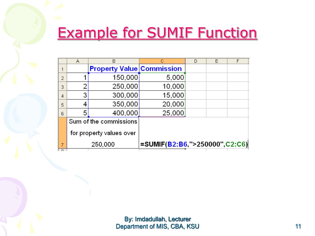 Example for SUMIF Function By: Imdadullah, Lecturer Department of MIS, CBA, KSU 11