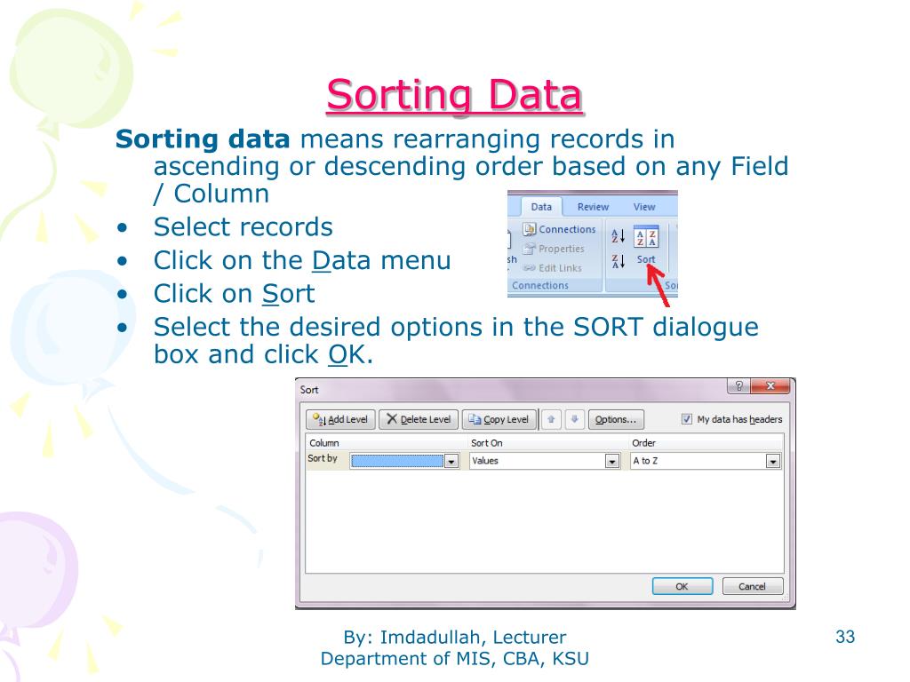 Sorting Data Sorting data means rearranging records in ascending or descending order based on any Field / Column • Select records • Click on the Data menu • Click on Sort • Select the desired options in the SORT dialogue box and click OK. By: Imdadullah, Lecturer Department of MIS, CBA, KSU