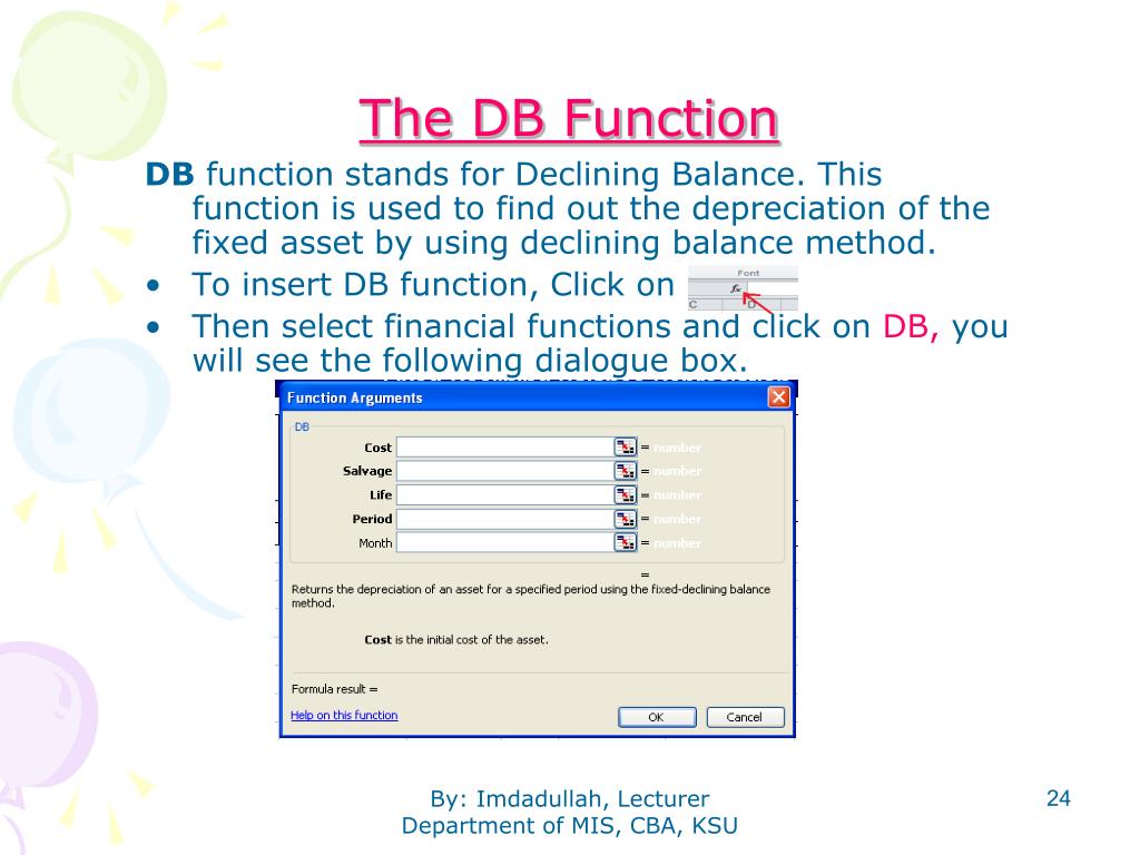 The DB Function DB function stands for Declining Balance. This function is used to find out the depreciation of the fixed asset by using declining balance method. • To insert DB function, Click on • Then select financial functions and click on DB, you will see the following dialogue box. By: Imdadullah, Lecturer Department of MIS, CBA, KSU