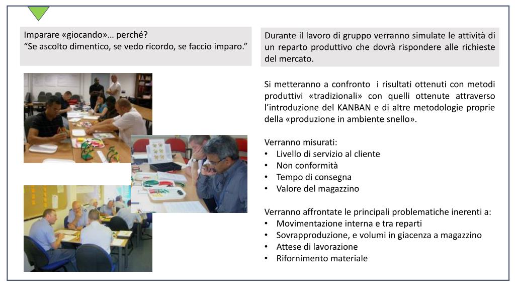 Imparare «giocando»… perché? “Se ascolto dimentico, se vedo ricordo, se faccio imparo.” Durante il lavoro di gruppo verranno simulate le attività di un reparto produttivo che dovrà rispondere alle richieste del mercato. • Si metteranno a confronto i risultati ottenuti con metodi produttivi «tradizionali» con quelli ottenute attraverso l’introduzione del KANBAN e di altre metodologie proprie della «produzione in ambiente snello». • Verranno misurati: • Livello di servizio al cliente • Non conformità • Tempo di consegna • Valore del magazzino • Verranno affrontate le principali problematiche inerenti a: • Movimentazione interna e tra reparti • Sovrapproduzione, e volumi in giacenza a magazzino • Attese di lavorazione • Rifornimento materiale