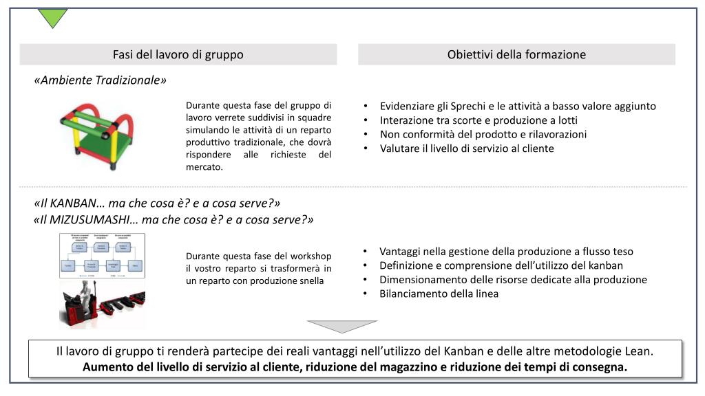 Fasi del lavoro di gruppo Obiettivi della formazione «Ambiente Tradizionale» • Evidenziare gli Sprechi e le attività a basso valore aggiunto • Interazione tra scorte e produzione a lotti • Non conformità del prodotto e rilavorazioni • Valutare il livello di servizio al cliente Durante questa fase del gruppo di lavoro verrete suddivisi in squadre simulando le attività di un reparto produttivo tradizionale, che dovrà rispondere alle richieste del mercato. «Il KANBAN… ma che cosa è? e a cosa serve?» «Il MIZUSUMASHI… ma che cosa è? e a cosa serve?» • Vantaggi nella gestione della produzione a flusso teso • Definizione e comprensione dell’utilizzo del kanban • Dimensionamento delle risorse dedicate alla produzione • Bilanciamento della linea Durante questa fase del workshop il vostro reparto si trasformerà in un reparto con produzione snella Il lavoro di gruppo ti renderà partecipe dei reali vantaggi nell’utilizzo del Kanban e delle altre metodologie Lean. Aumento del livello di servizio al cliente, riduzione del magazzino e riduzione dei tempi di consegna.