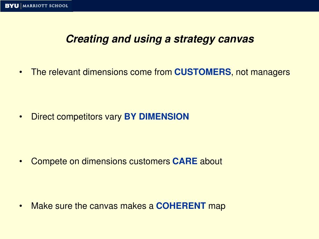 Creating and using a strategy canvas • The relevant dimensions come from CUSTOMERS, not managers • Direct competitors vary BY DIMENSION • Compete on dimensions customers CARE about • Make sure the canvas makes a COHERENT map
