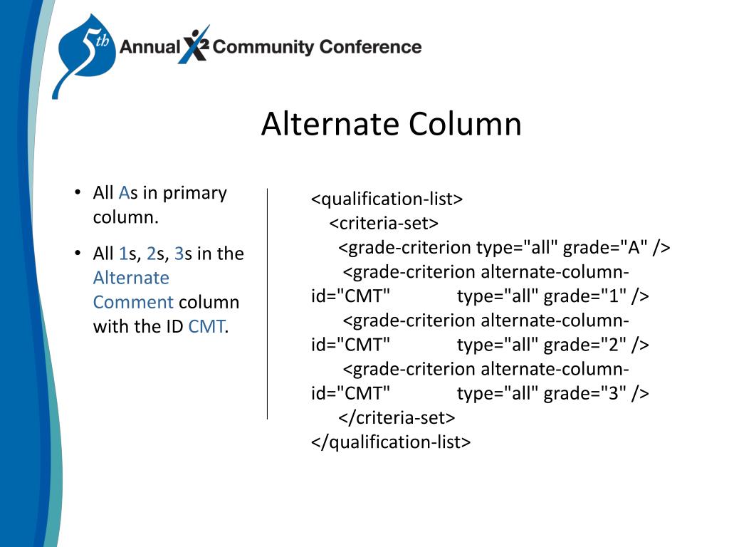 Alternate Column • All As in primary column. • All 1s, 2s, 3s in the Alternate Comment column with the ID CMT. <qualification-list> <criteria-set> <grade-criterion type="all" grade="A" /> <grade-criterion alternate-column-id="CMT" type="all" grade="1" /> <grade-criterion alternate-column-id="CMT" type="all" grade="2" /> <grade-criterion alternate-column-id="CMT" type="all" grade="3" /> </criteria-set> </qualification-list>