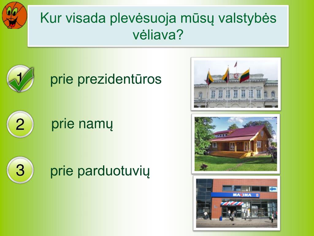 Kur visada plevėsuoja mūsų valstybės vėliava? prie prezidentūros prie parduotuvių prie namų