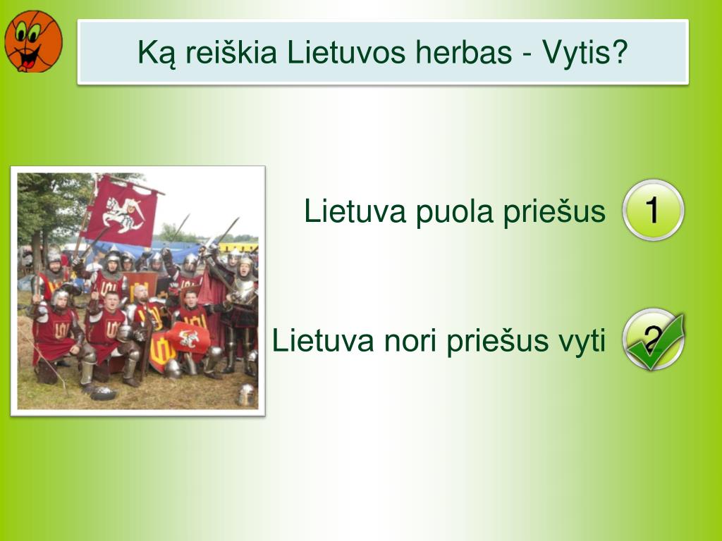 Tu laimėjai krepšinio rungtynes, nes daug žinai apie Lietuvą. Įsivertink 1 2 Tu likai antroje vietoje, nes šiek tiek žinai apie Lietuvą. Tu pralaimėjai rugtynes, nes dardaug ko nežinai apie Lietuvą.