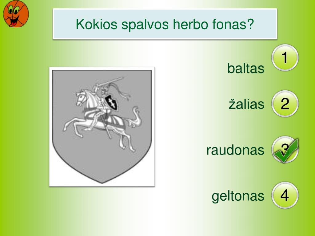 Kokios spalvos herbo fonas? baltas žalias raudonas geltonas