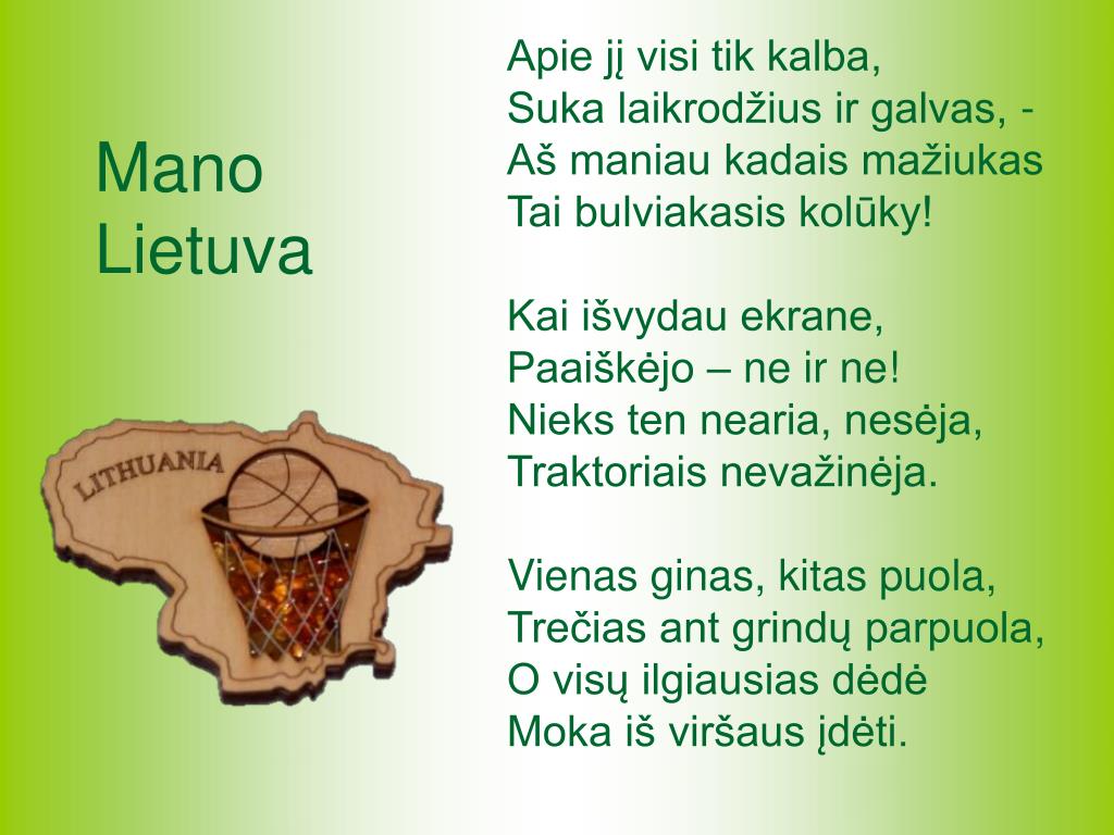 Apie jį visi tik kalba, Suka laikrodžius ir galvas, - Aš maniau kadais mažiukas Tai bulviakasis kolūky! Kai išvydau ekrane, Paaiškėjo – ne ir ne! Nieks ten nearia, nesėja, Traktoriais nevažinėja. Vienas ginas, kitas puola, Trečias ant grindų parpuola, O visų ilgiausias dėdė Moka iš viršaus įdėti. Mano Lietuva