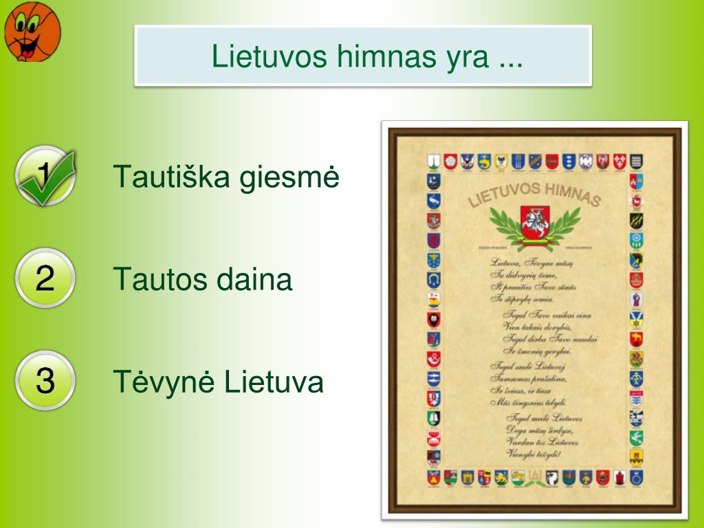 Lietuvos himnas yra ... Tautiška giesmė Tautos daina Tėvynė Lietuva