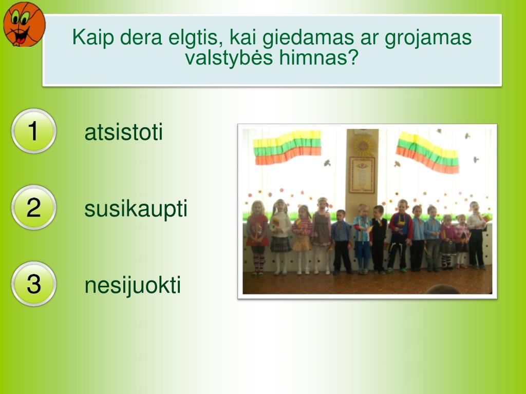 Kaip dera elgtis, kai giedamas ar grojamas valstybės himnas? atsistoti susikaupti nesijuokti