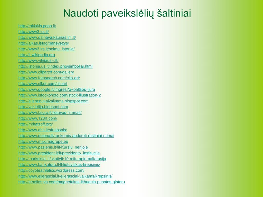 Naudoti paveikslėlių šaltiniai • http://rokiskis.popo.lt/ • http://www3.lrs.lt/ • http://www.dainava.kaunas.lm.lt/ • http://alkas.lt/tag/panevezys/ • http://www3.lrs.lt/seimu_istorija/ • http://lt.wikipedia.org • http://www.vilniaus-r.lt/ • http://istorija.us.lt/index.php/simboliai.html • http://www.clipartof.com/gallery • http://www.fotosearch.com/clip-art/ • http://www.clker.com/clipart • http://www.google.lt/imgres?q=baltijos+jura • http://www.istockphoto.com/stock-illustration-2 • http://eilerastukaivaikams.blogspot.com • http://vokietija.blogspot.com • http://www.taigra.lt/lietuvos-himnas/ • http://www.123rf.com/ • http://mrkatzoff.org/ • http://www.alfa.lt/straipsnis/ • http://www.dolena.lt/rankomis-apdoroti-rastiniai-namai • http://www.maximagrupe.eu • http://www.pasienis.lt/lit/Kursiu_nerijoje_ • http://www.president.lt/lt/prezidento_institucija • http://marksistai.lt/skaityti/10-mitu-apie-baltarusija • http://www.karikatura.lt/lt/lietuviskas-krepsinis/ • http://coyoteathletics.wordpress.com/ • http://www.eilerasciai.lt/eilerasciai-vaikams/krepsinis/ • http://etnolietuva.com/magnetukas-lithuania-puostas-gintaru