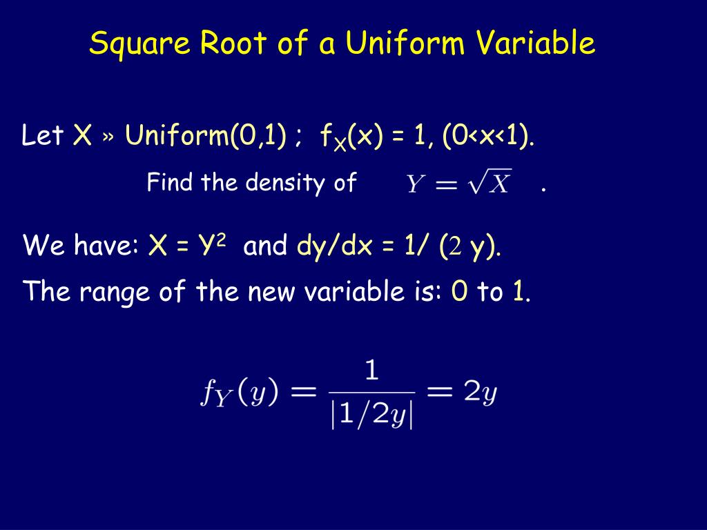 Square Root of a Uniform Variable Let X » Uniform(0,1) ; fX(x) = 1, (0<x<1). Find the densityof .a We have: X = Y2 and dy/dx = 1/ (2 y). The range of the new variable is: 0 to 1.