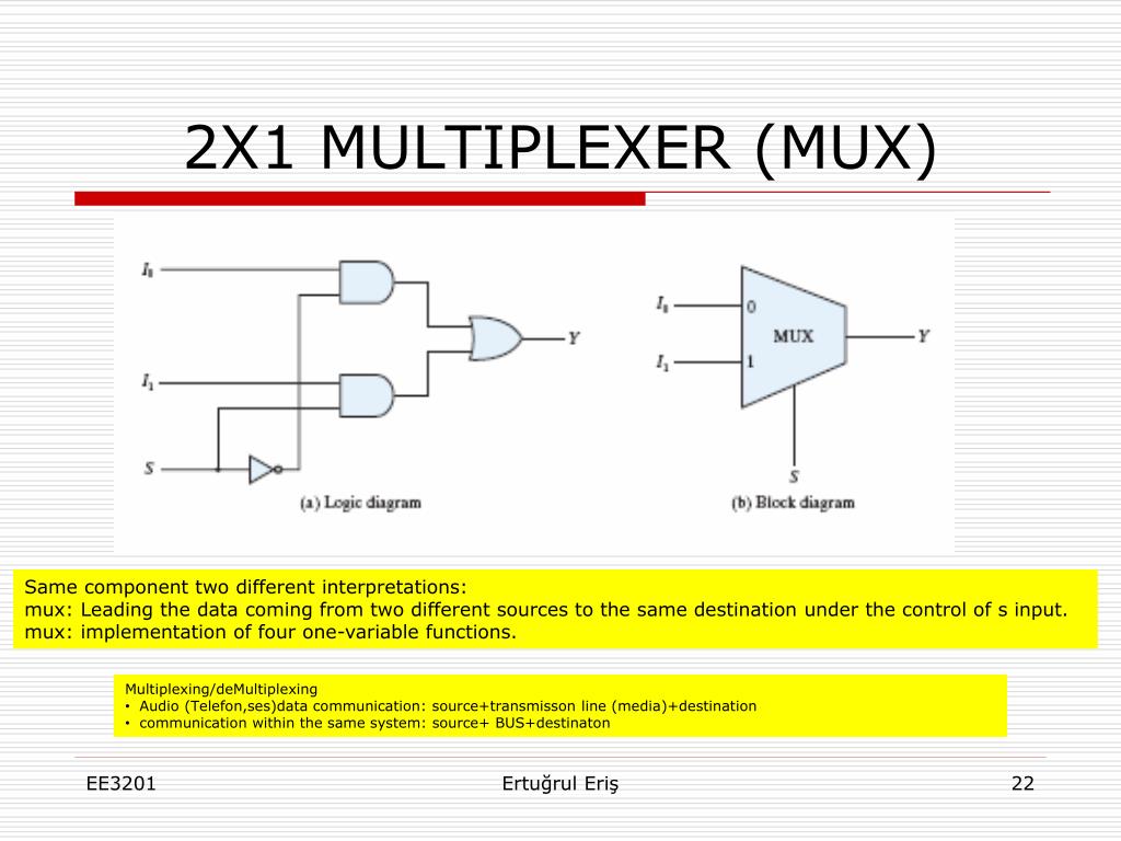 2X1 MULTIPLEXER (MUX) Same component two different interpretations: mux: Leading the data coming from two different sources to the same destination under the control of s input. mux: implementation of four one-variable functions. • Multiplexing/deMultiplexing • Audio (Telefon,ses)data communication: source+transmisson line (media)+destination • communication within the same system: source+ BUS+destinaton Ertuğrul Eriş