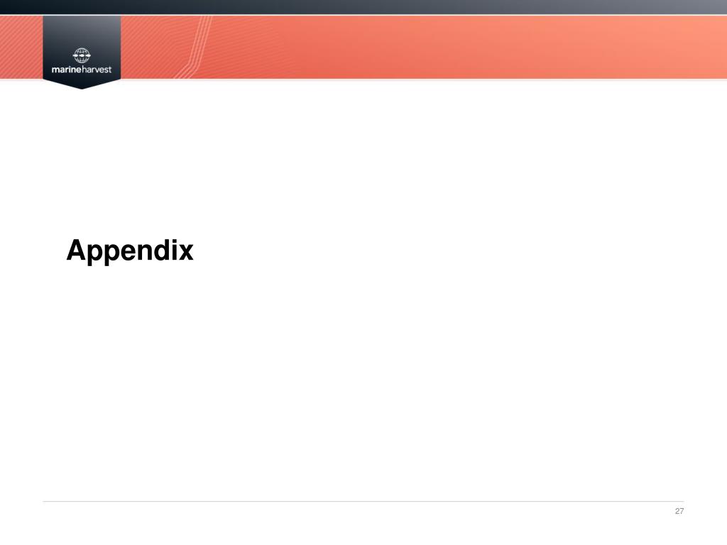 Nova Sea • Leading integrated salmon producer in Northern Norway • 31.33 wholly owned licenses • 6 partly owned licenses • Marine Harvest has an ownership in Nova Sea of ~48% through direct and indirect shareholdings • 2012 dividends to Marine Harvest • NOK 19m (Q2) and NOK 5m (Q4) • Proportion of income after tax reported as income from associated companies in Marine Harvest Norway • NOK 40.6 million in Q1 2013 • IFRS adjustment of biomass NOK 1.3m