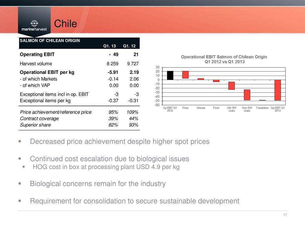 Chile • Decreased price achievement despite higher spot prices • Continued cost escalation due to biological issues • HOG cost in box at processing plant USD 4.9 per kg • Biological concerns remain for the industry • Requirement for consolidation to secure sustainable development