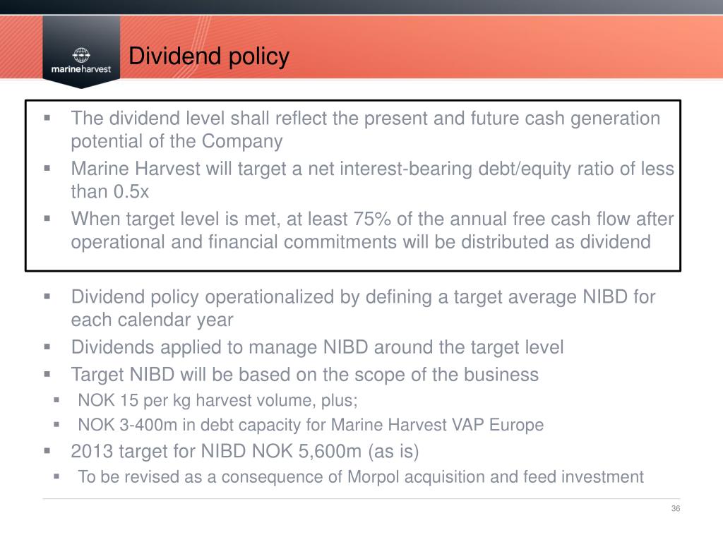 Dividend policy • The dividend level shall reflect the present and future cash generation potential of the Company • Marine Harvest will target a net interest-bearing debt/equity ratio of less than 0.5x • When target level is met, at least 75% of the annual free cash flow after operational and financial commitments will be distributed as dividend • Dividend policy operationalized by defining a target average NIBD for each calendar year • Dividends applied to manage NIBD around the target level • Target NIBD will be based on the scope of the business • NOK 15 per kg harvest volume, plus; • NOK 3-400m in debt capacity for Marine Harvest VAP Europe • 2013 target for NIBD NOK 5,600m (as is) • To be revised as a consequence of Morpol acquisition and feed investment