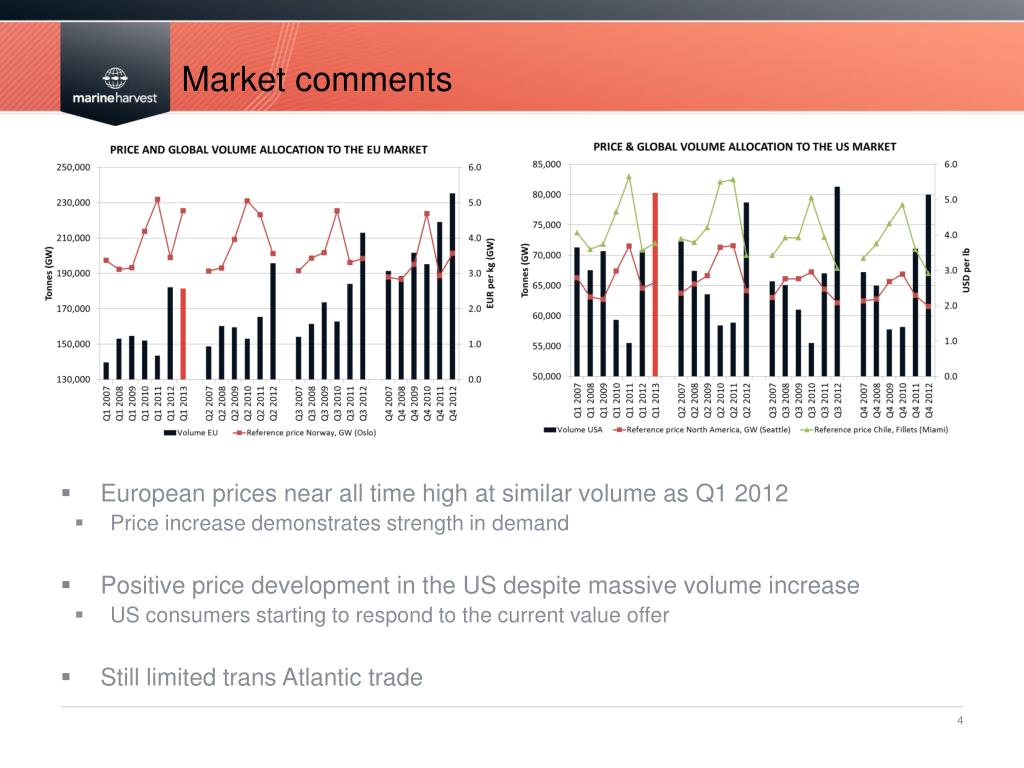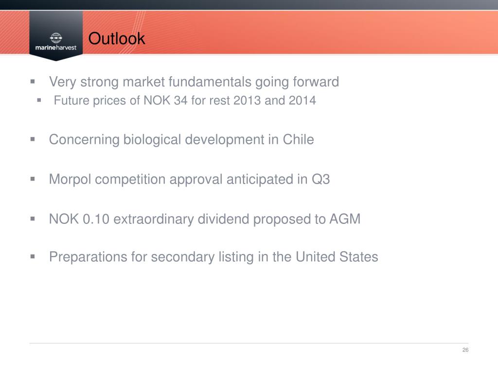 Outlook • Very strong market fundamentals going forward • Future prices of NOK 34 for rest 2013 and 2014 • Concerning biological development in Chile • Morpol competition approval anticipated in Q3 • NOK 0.10 extraordinary dividend proposed to AGM • Preparations for secondary listing in the United States