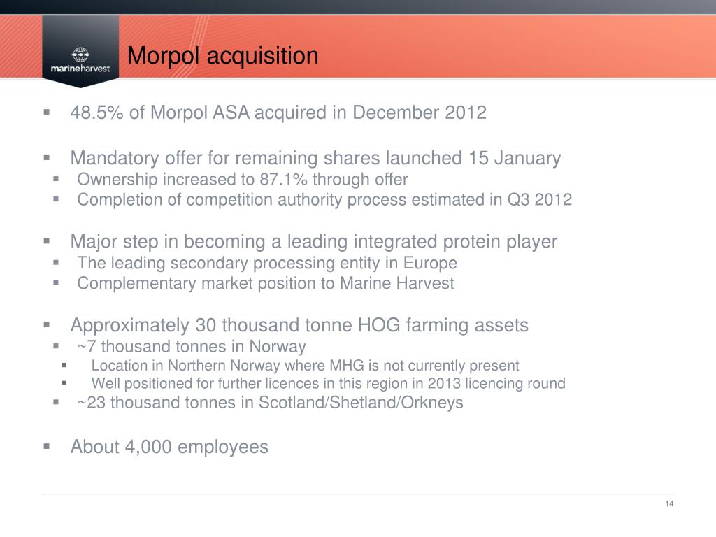 Morpol acquisition • 48.5% of Morpol ASA acquired in December 2012 • Mandatory offer for remaining shares launched 15 January • Ownership increased to 87.1% through offer • Completion of competition authority process estimated in Q3 2012 • Major step in becoming a leading integrated protein player • The leading secondary processing entity in Europe • Complementary market position to Marine Harvest • Approximately 30 thousand tonne HOG farming assets • ~7 thousand tonnes in Norway • Location in Northern Norway where MHG is not currently present • Well positioned for further licences in this region in 2013 licencing round • ~23 thousand tonnes in Scotland/Shetland/Orkneys • About 4,000 employees