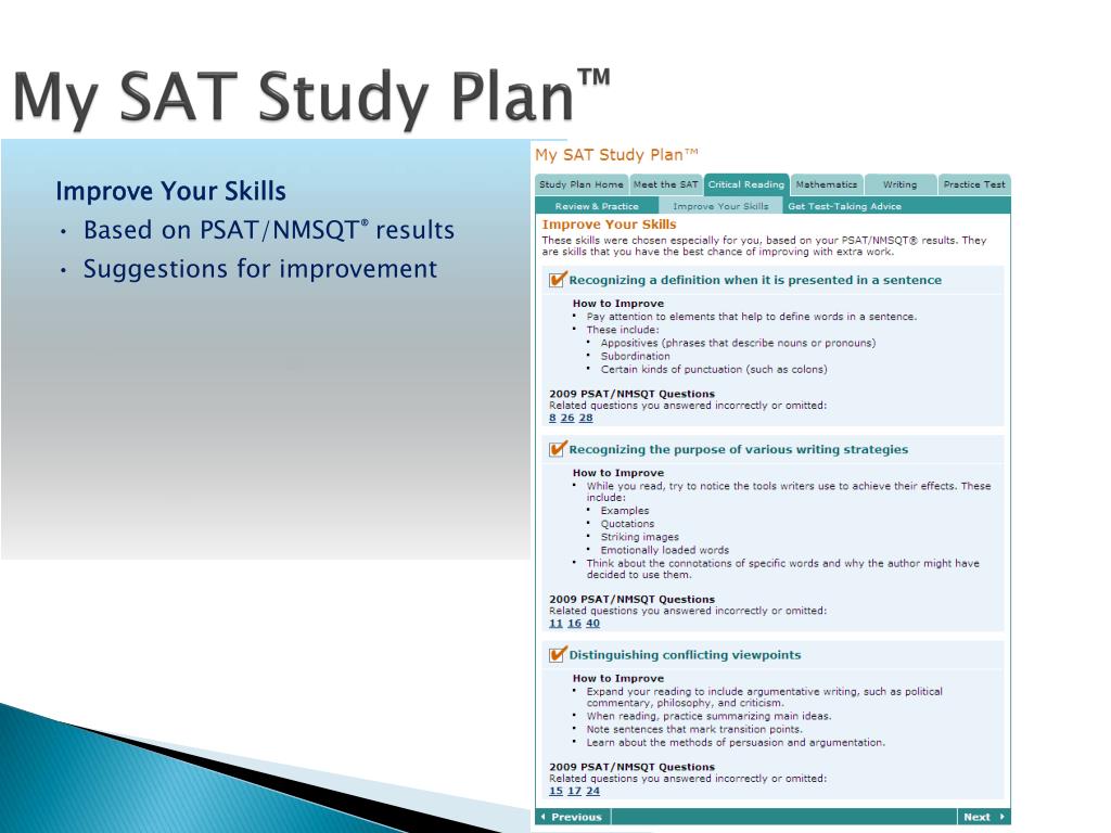 My SAT Study Plan™ • Improve Your Skills • Based on PSAT/NMSQT® results • Suggestions for improvement