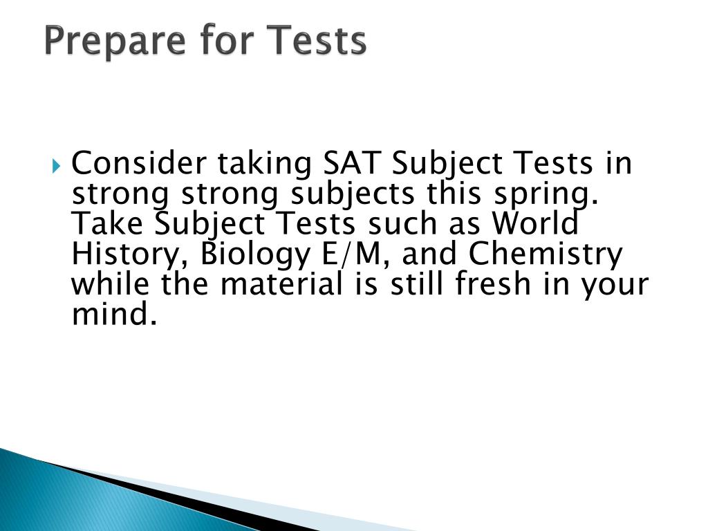Prepare for Tests • Consider taking SAT Subject Tests in strong strong subjects this spring. Take Subject Tests such as World History, Biology E/M, and Chemistry while the material is still fresh in your mind.