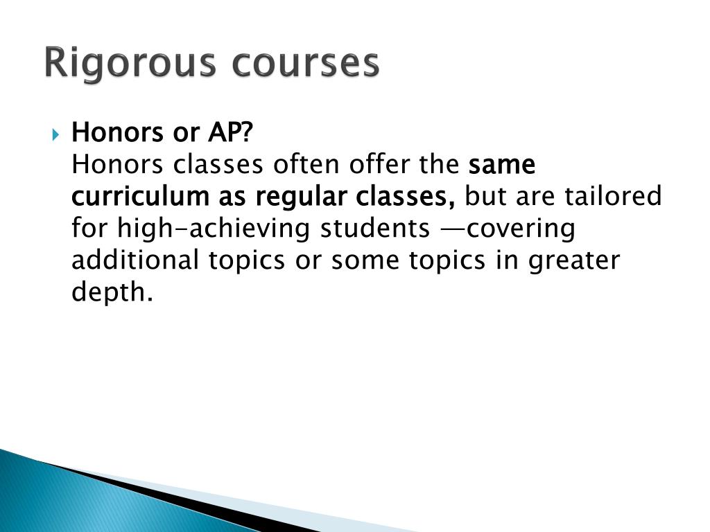 Rigorous courses • Honors or AP?Honors classes often offer the same curriculum as regular classes, but are tailored for high-achieving students —covering additional topics or some topics in greater depth.