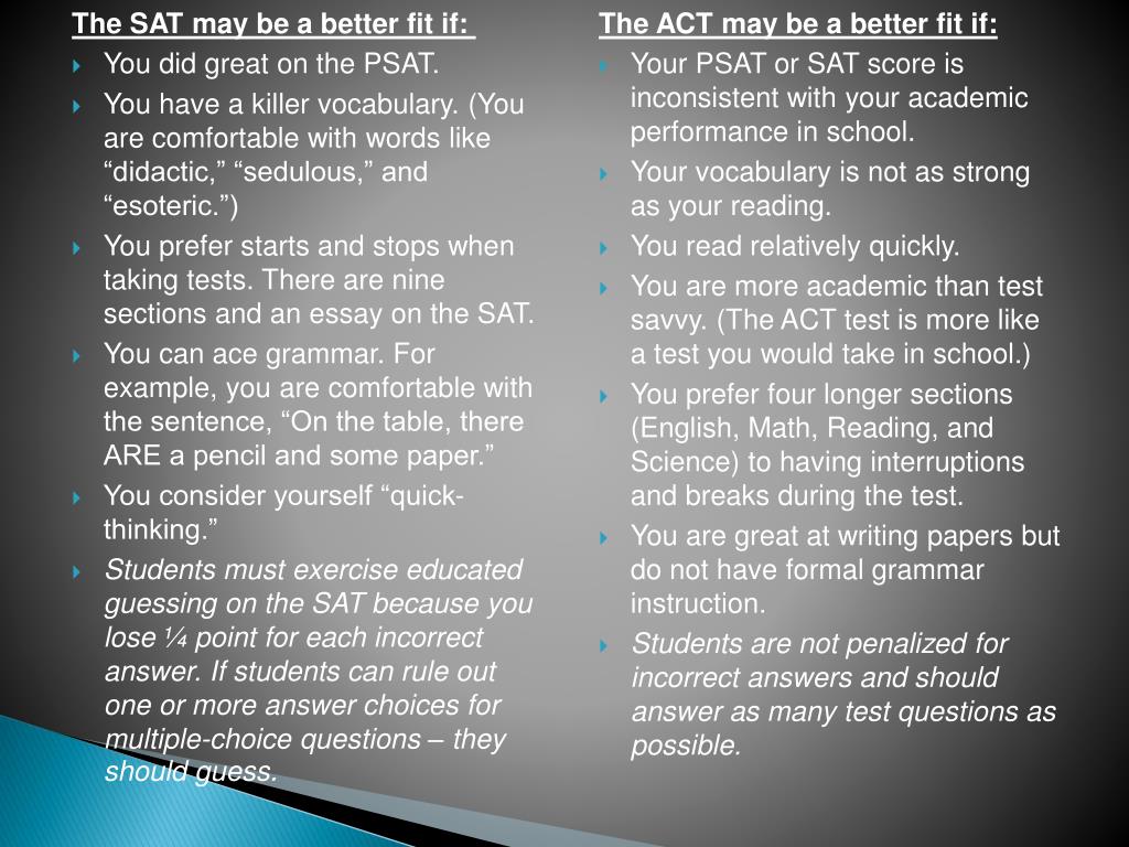 The SAT may be a better fit if: • You did great on the PSAT. • You have a killer vocabulary. (You are comfortable with words like “didactic,” “sedulous,” and “esoteric.”) • You prefer starts and stops when taking tests. There are nine sections and an essay on the SAT. • You can ace grammar. For example, you are comfortable with the sentence, “On the table, there ARE a pencil and some paper.” • You consider yourself “quick-thinking.” • Students must exercise educated guessing on the SAT because you lose ¼ point for each incorrect answer. If students can rule out one or more answer choices for multiple-choice questions – they should guess. The ACT may be a better fit if: • Your PSAT or SAT score is inconsistent with your academic performance in school. • Your vocabulary is not as strong as your reading. • You read relatively quickly. • You are more academic than test savvy. (The ACT test is more like a test you would take in school.) • You prefer four longer sections (English, Math, Reading, and Science) to having interruptions and breaks during the test. • You are great at writing papers but do not have formal grammar instruction. • Students are not penalized for incorrect answers and should answer as many test questions as possible.