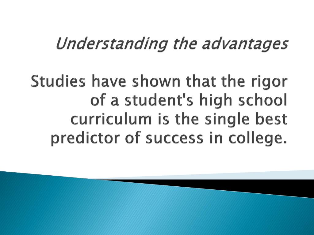 Understanding the advantagesStudies have shown that the rigor of a student's high school curriculum is the single best predictor of success in college.