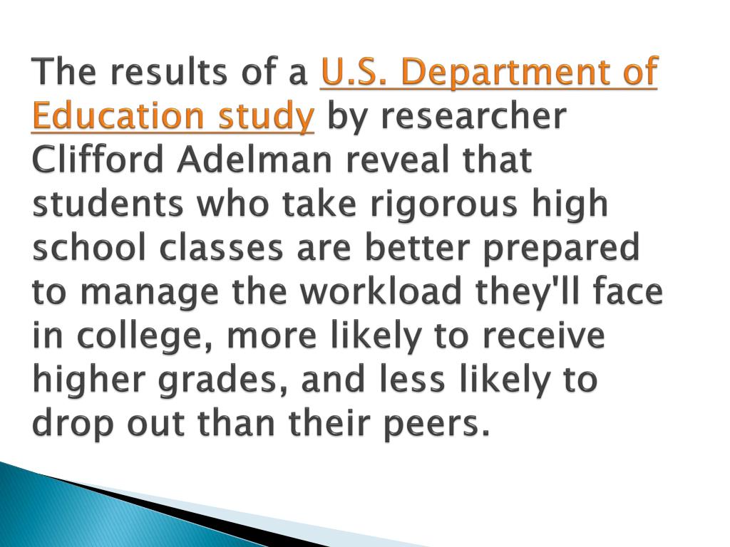 The results of a U.S. Department of Education study by researcher Clifford Adelman reveal that students who take rigorous high school classes are better prepared to manage the workload they'll face in college, more likely to receive higher grades, and less likely to drop out than their peers.