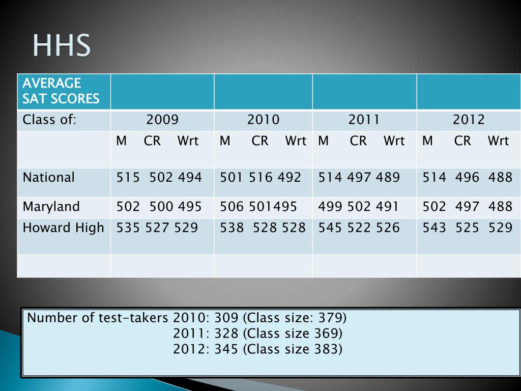 HHS Number of test-takers 2010: 309 (Class size: 379) 2011: 328 (Class size 369) 2012: 345 (Class size 383)