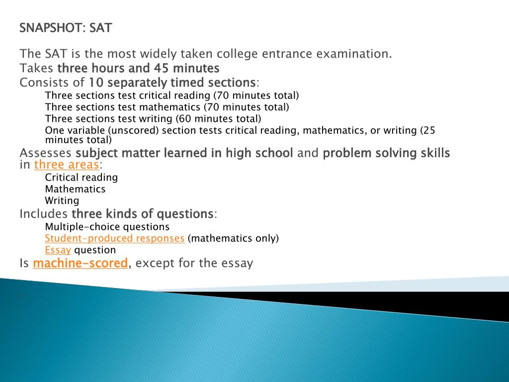 SNAPSHOT: SAT The SAT is the most widely taken college entrance examination. Takes three hours and 45 minutes Consists of 10 separately timed sections: Three sections test critical reading (70 minutes total) Three sections test mathematics (70 minutes total) Three sections test writing (60 minutes total) One variable (unscored) section tests critical reading, mathematics, or writing (25 minutes total) Assesses subject matter learned in high school and problem solving skills in three areas: Critical reading Mathematics Writing Includes three kinds of questions: Multiple-choice questions Student-produced responses (mathematics only) Essay question Is machine-scored, except for the essay .