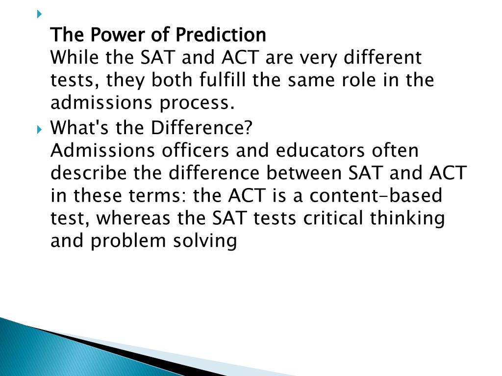 The Power of PredictionWhile the SAT and ACT are very different tests, they both fulfill the same role in the admissions process. • What's the Difference?Admissions officers and educators often describe the difference between SAT and ACT in these terms: the ACT is a content-based test, whereas the SAT tests critical thinking and problem solving