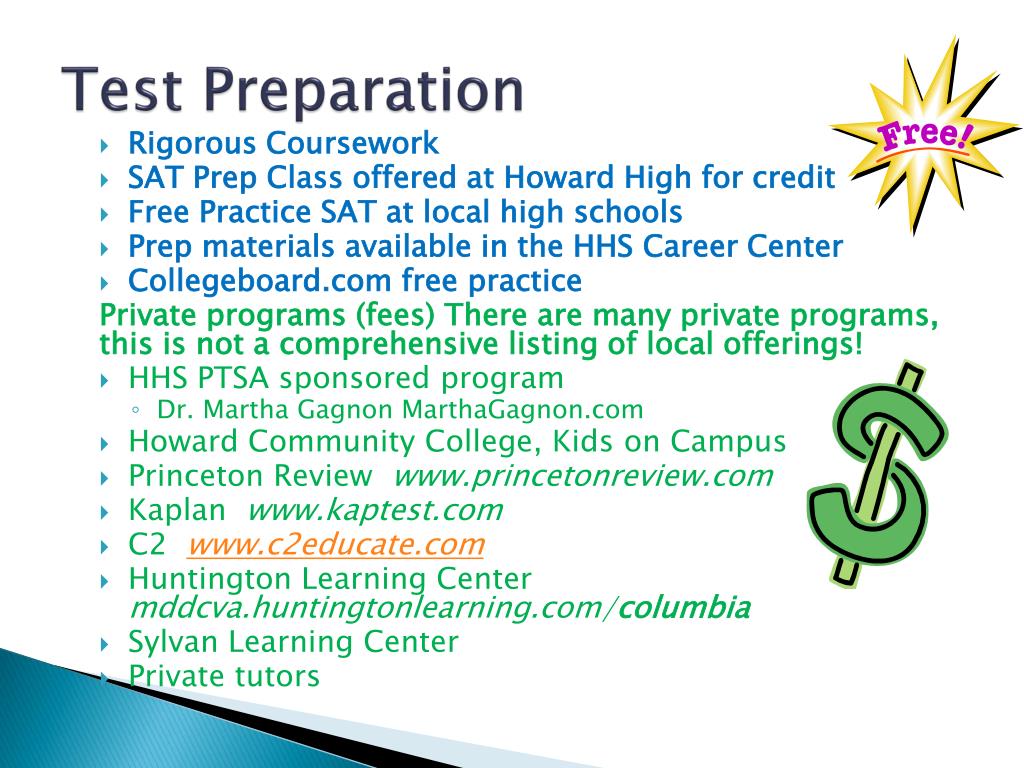 Test Preparation • Rigorous Coursework • SAT Prep Class offered at Howard High for credit • Free Practice SAT at local high schools • Prep materials available in the HHS Career Center • Collegeboard.com free practice Private programs (fees) There are many private programs, this is not a comprehensive listing of local offerings! • HHS PTSA sponsored program • Dr. Martha Gagnon MarthaGagnon.com • Howard Community College, Kids on Campus • Princeton Review www.princetonreview.com • Kaplan www.kaptest.com • C2 www.c2educate.com • Huntington Learning Center mddcva.huntingtonlearning.com/columbia • Sylvan Learning Center • Private tutors