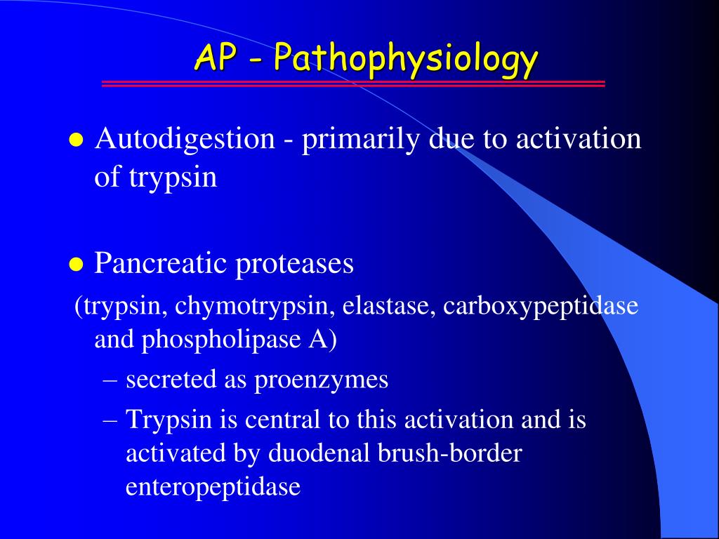 AP - Pathophysiology • Autodigestion - primarily due to activation of trypsin • Pancreatic proteases (trypsin, chymotrypsin, elastase, carboxypeptidase and phospholipase A) • secreted as proenzymes • Trypsin is central to this activation and is activated by duodenal brush-border enteropeptidase