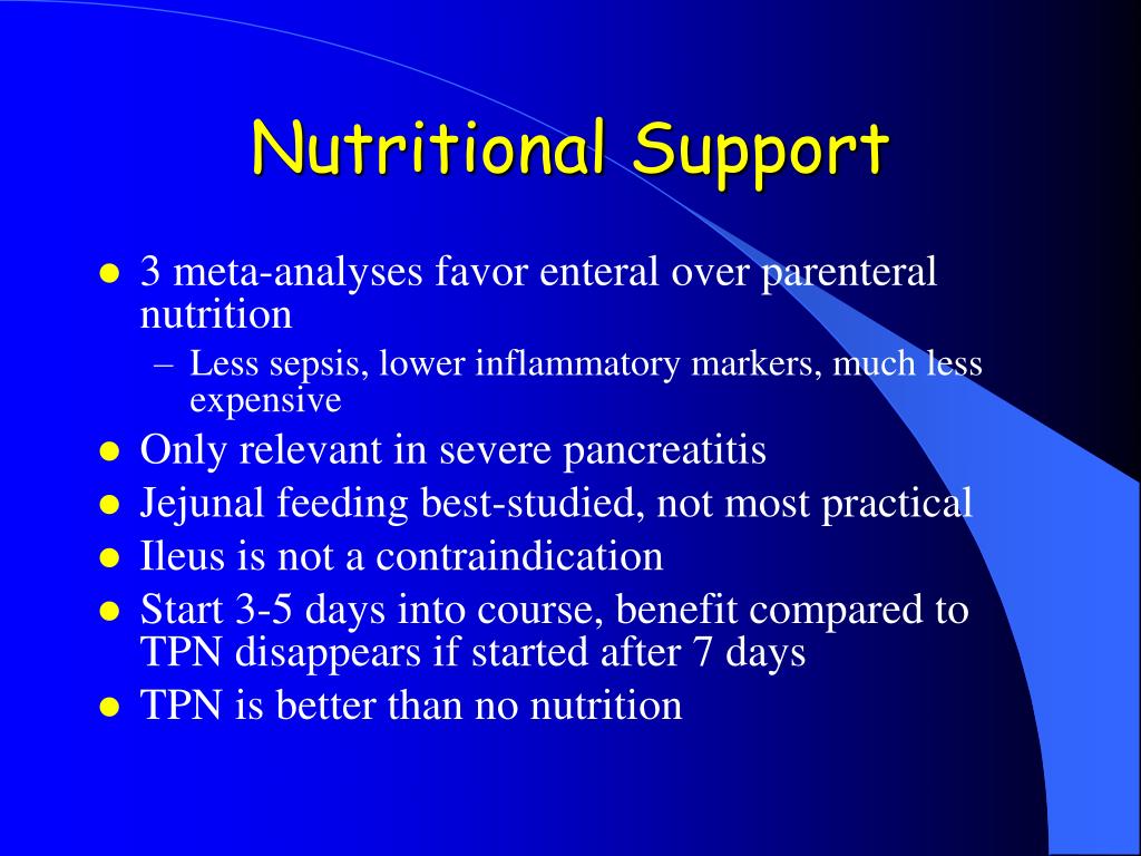 Nutritional Support • 3 meta-analyses favor enteral over parenteral nutrition • Less sepsis, lower inflammatory markers, much less expensive • Only relevant in severe pancreatitis • Jejunal feeding best-studied, not most practical • Ileus is not a contraindication • Start 3-5 days into course, benefit compared to TPN disappears if started after 7 days • TPN is better than no nutrition