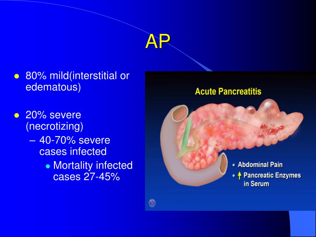 AP • 80% mild(interstitial or edematous) • 20% severe (necrotizing) • 40-70% severe cases infected • Mortality infected cases 27-45%