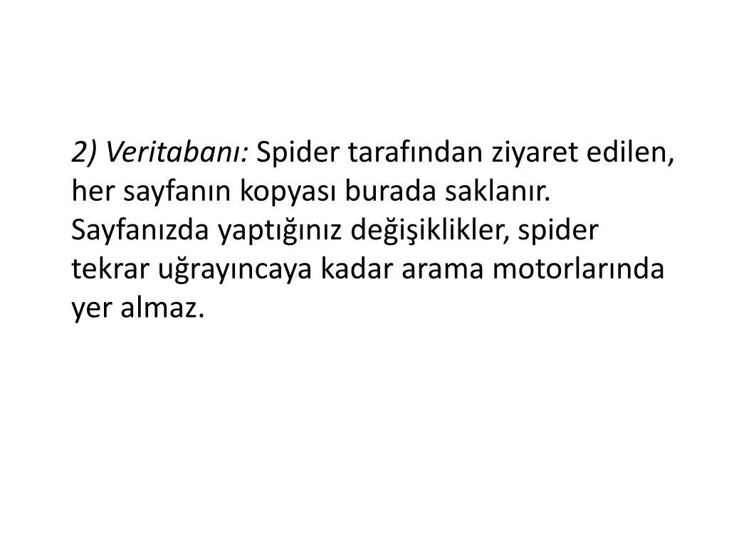 2) Veritabanı: Spider tarafından ziyaret edilen, her sayfanın kopyası burada saklanır. Sayfanızda yaptığınız değişiklikler, spider tekrar uğrayıncaya kadar arama motorlarında yer almaz.