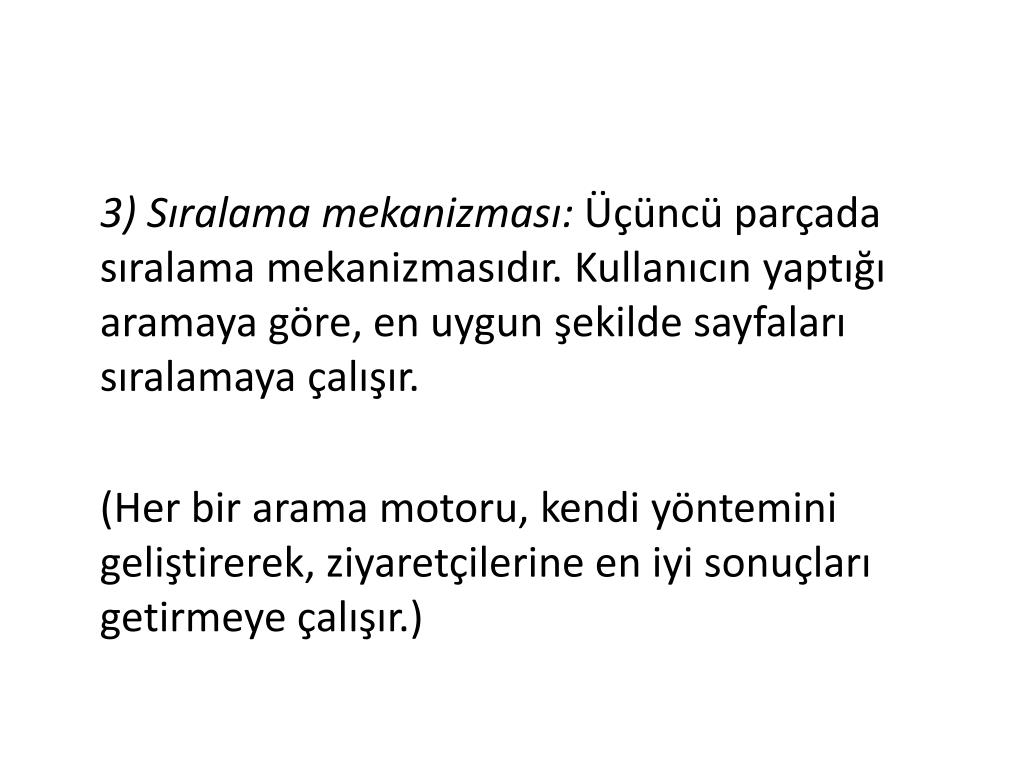 3) Sıralama mekanizması: Üçüncü parçada sıralama mekanizmasıdır. Kullanıcın yaptığı aramaya göre, en uygun şekilde sayfaları sıralamaya çalışır. (Her bir arama motoru, kendi yöntemini geliştirerek, ziyaretçilerine en iyi sonuçları getirmeye çalışır.)