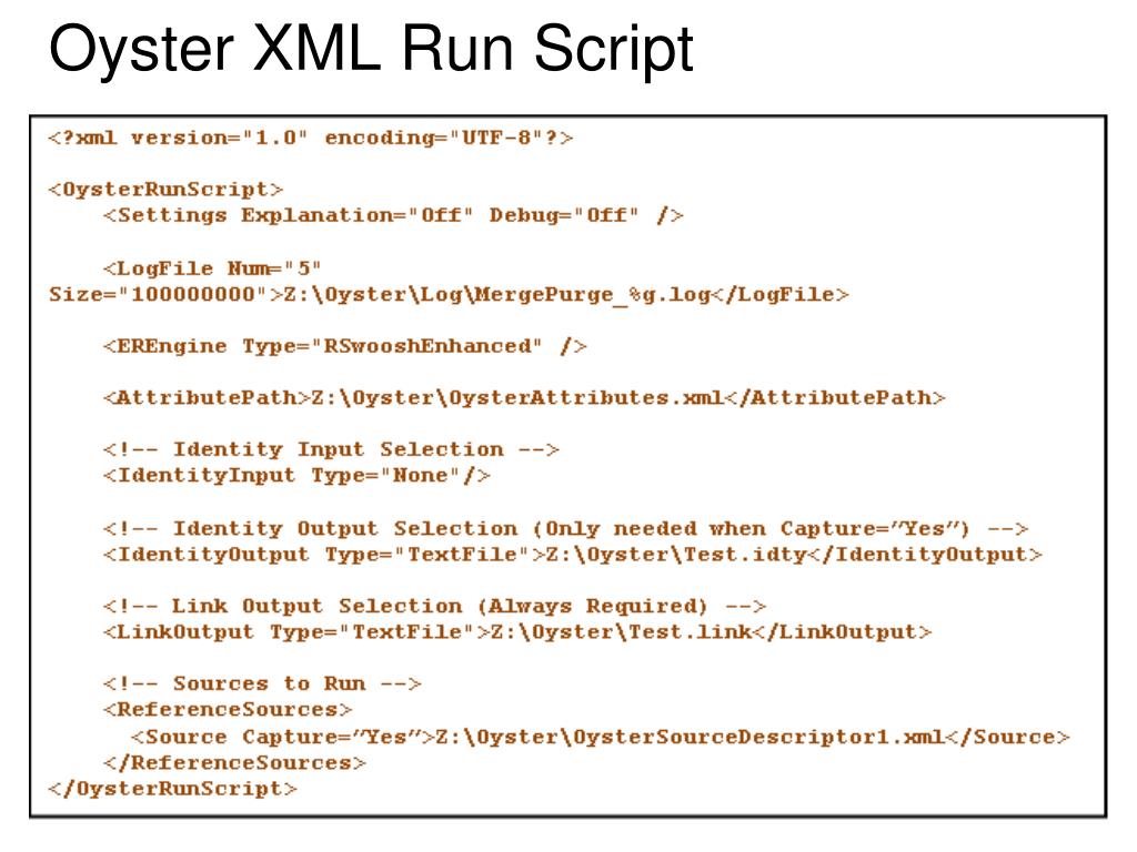What is Oyster? Open-System Entity Resolution Not database-driven, pure XML Java source code (unicode support) Matching by either Fellegi-Sunter or R-Swoosh methodologies