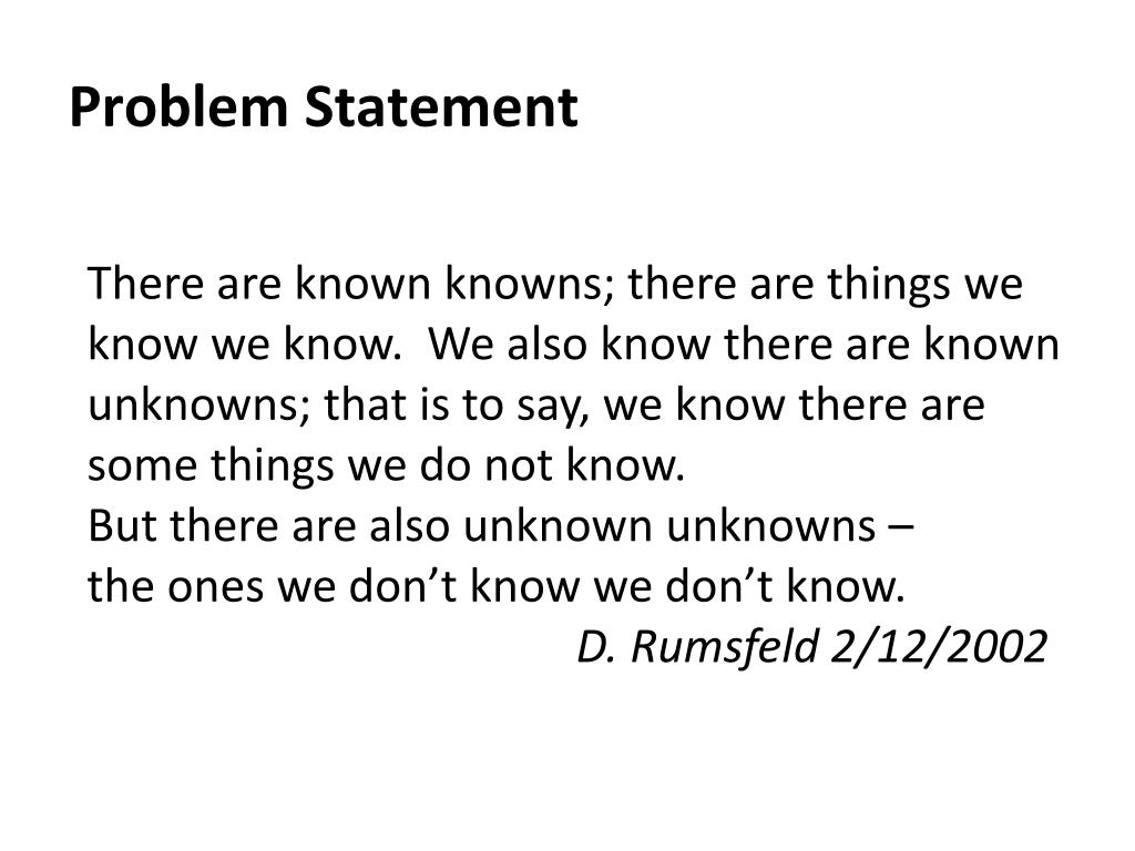Problem Statement There are known knowns; there are things we know we know. We also know there are known unknowns; that is to say, we know there are some things we do not know. But there are also unknown unknowns – the ones we don’t know we don’t know. D. Rumsfeld 2/12/2002