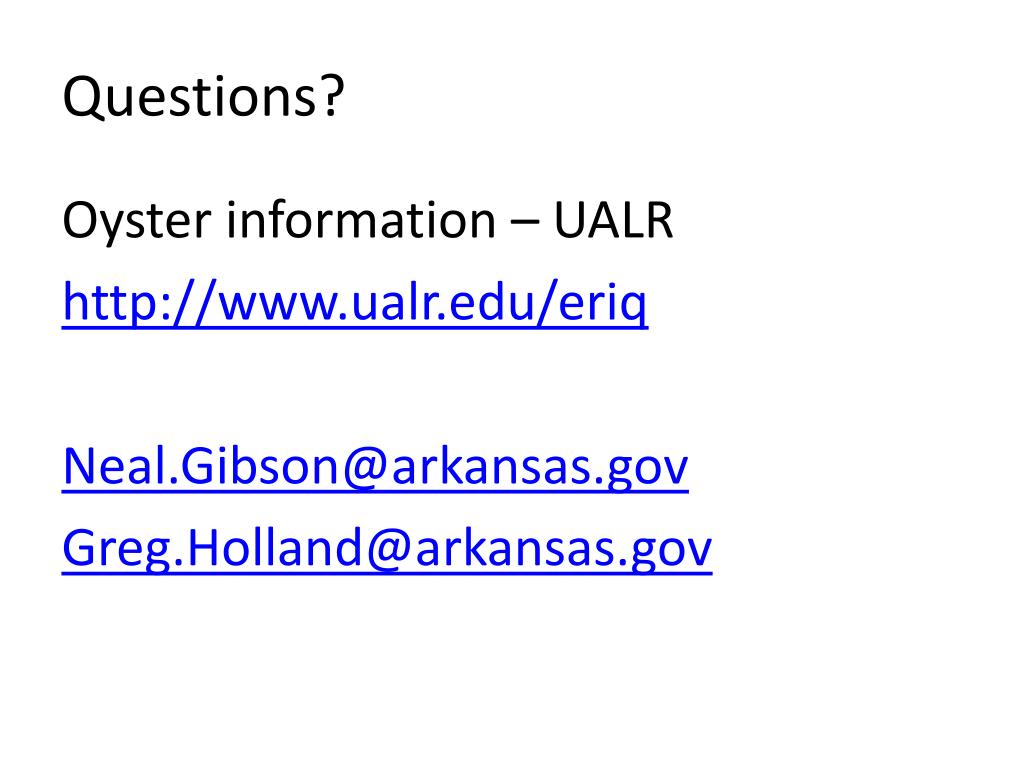 Questions? Oyster information – UALR http://www.ualr.edu/eriq Neal.Gibson@arkansas.gov Greg.Holland@arkansas.gov