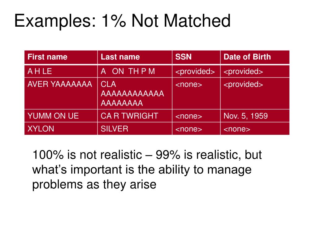 Examples: 1% Not Matched 100% is not realistic – 99% is realistic, but what’s important is the ability to manage problems as they arise