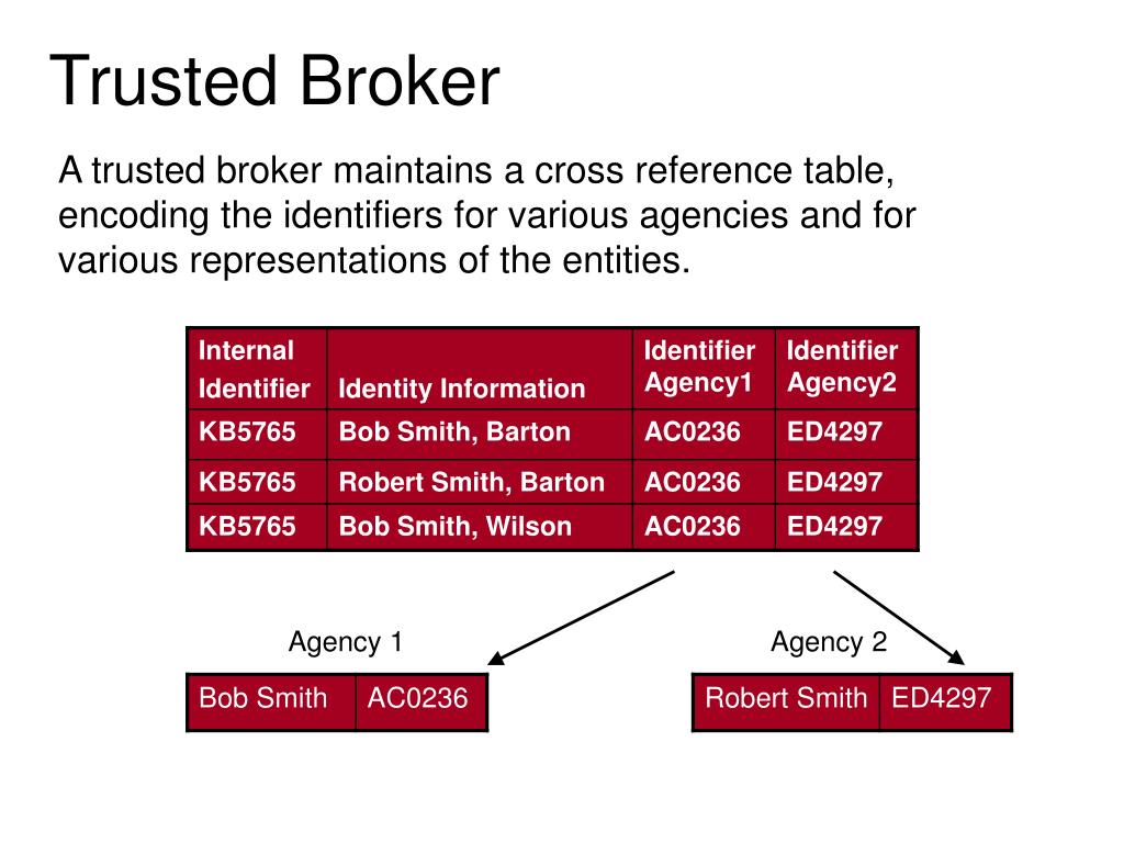 Trusted Broker A trusted broker maintains a cross reference table, encoding the identifiers for various agencies and for various representations of the entities. Agency 1 Agency 2