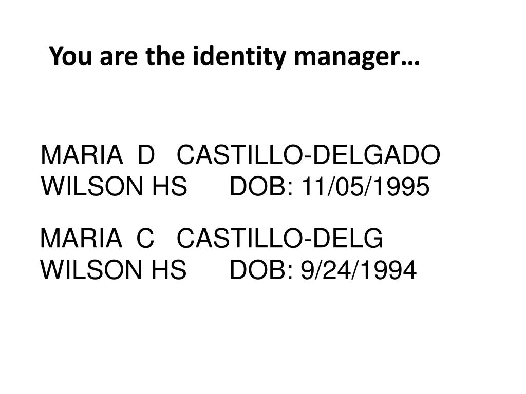You are the identity manager… MARIA D WILSON HS CASTILLO-DELGADO DOB: 11/05/1995 MARIA C WILSON HS CASTILLO-DELG DOB: 9/24/1994
