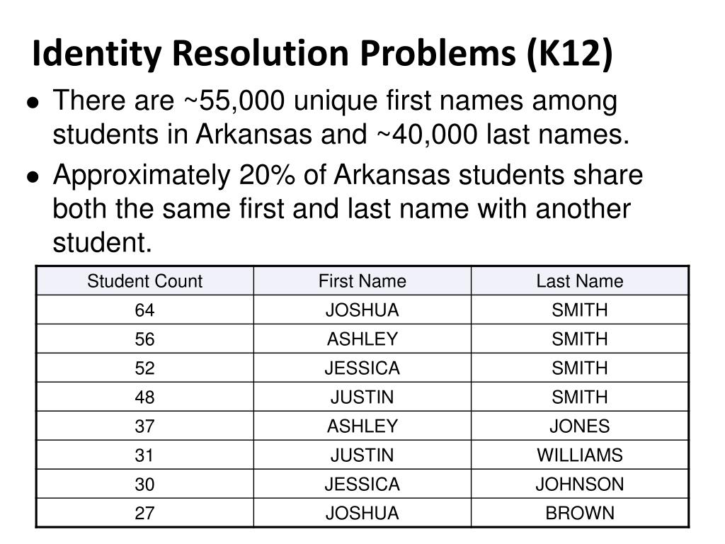 Identity Resolution Problems (K12) • There are ~55,000 unique first names among students in Arkansas and ~40,000 last names. • Approximately 20% of Arkansas students share both the same first and last name with another student.