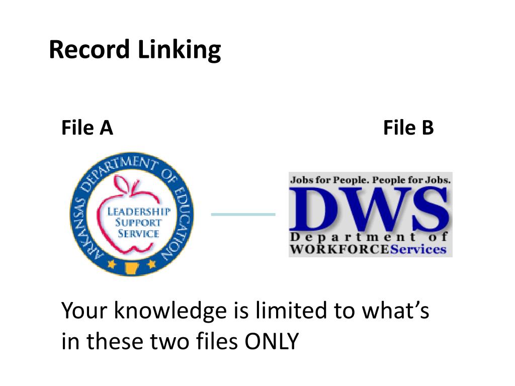 Record Linking File A File B Your knowledge is limited to what’s in these two files ONLY