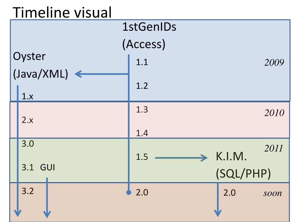 Timeline visual Oyster (Java/XML) 1stGenIDs (Access) 1.1 1.2 1.3 1.4 1.5 2.0 2009 1.x 2.x 3.0 3.1 3.2 2010 2011 K.I.M. (SQL/PHP) GUI 2.0 soon