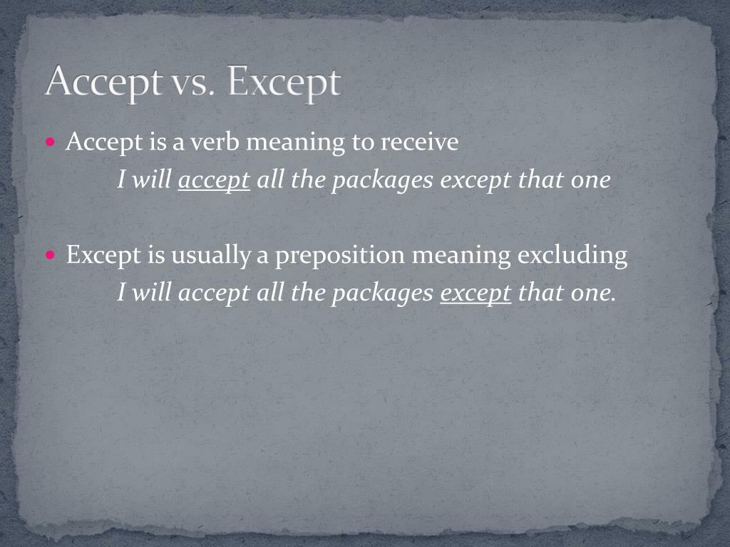 Accept vs. Except • Accept is a verb meaning to receive I will accept all the packages except that one • Except is usually a preposition meaning excluding I will accept all the packages except that one.
