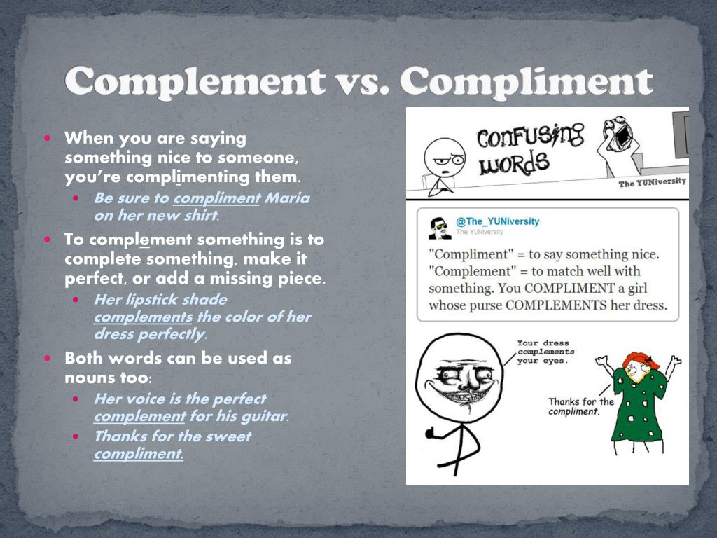 Complement vs. Compliment • When you are saying something nice to someone, you’re complimenting them. • Be sure to compliment Maria on her new shirt. • To complement something is to complete something, make it perfect, or add a missing piece. • Her lipstick shade complements the color of her dress perfectly. • Both words can be used as nouns too: • Her voice is the perfect complement for his guitar. • Thanks for the sweet compliment.