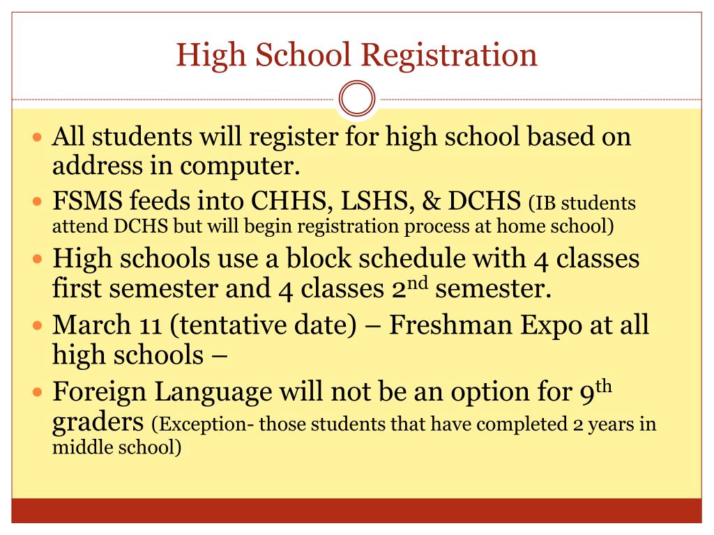 High School Registration All students will register for high school based on address in computer. FSMS feeds into CHHS, LSHS, & DCHS (IB students attend DCHS but will begin registration process at home school) High schools use a block schedule with 4 classes first semester and 4 classes 2nd semester. March 11 (tentative date) – Freshman Expo at all high schools – Foreign Language will not be an option for 9th graders (Exception- those students that have completed 2 years in middle school)